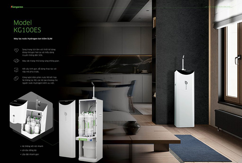 Máy lọc nước Kangaroo Hydrogen ion kiềm KG100ES thiết kế tinh giản, nhỏ gọn hơn 50% so với máy lọc nước truyền thống giúp tiết kiệm diện tích. Kiểu dáng đứng thon gọn, cùng màu sắc trang nhã, bắt mắt giúp không gian của bạn trở nên sang trọng, lịch lãm và hiện đại phù hợp với nhiều vị trí khác nhau trong gia đình, văn phòng, trường học, bệnh viện. Phần nắp phía trước có thể mở ra 1 phần hoặc toàn bộ rất dễ dàng, tiện lợi.